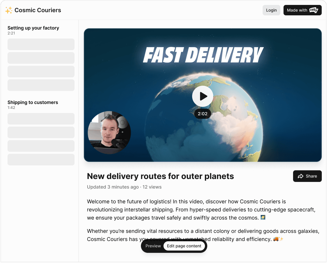 Alternating presenters or try new voiceovers, even on published content. Rally manages content and webcam recordings separately, giving you the flexibility to change presenters (or what they present) whenever you want.
